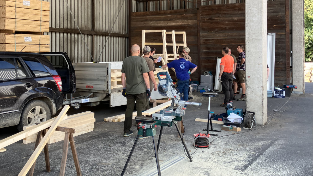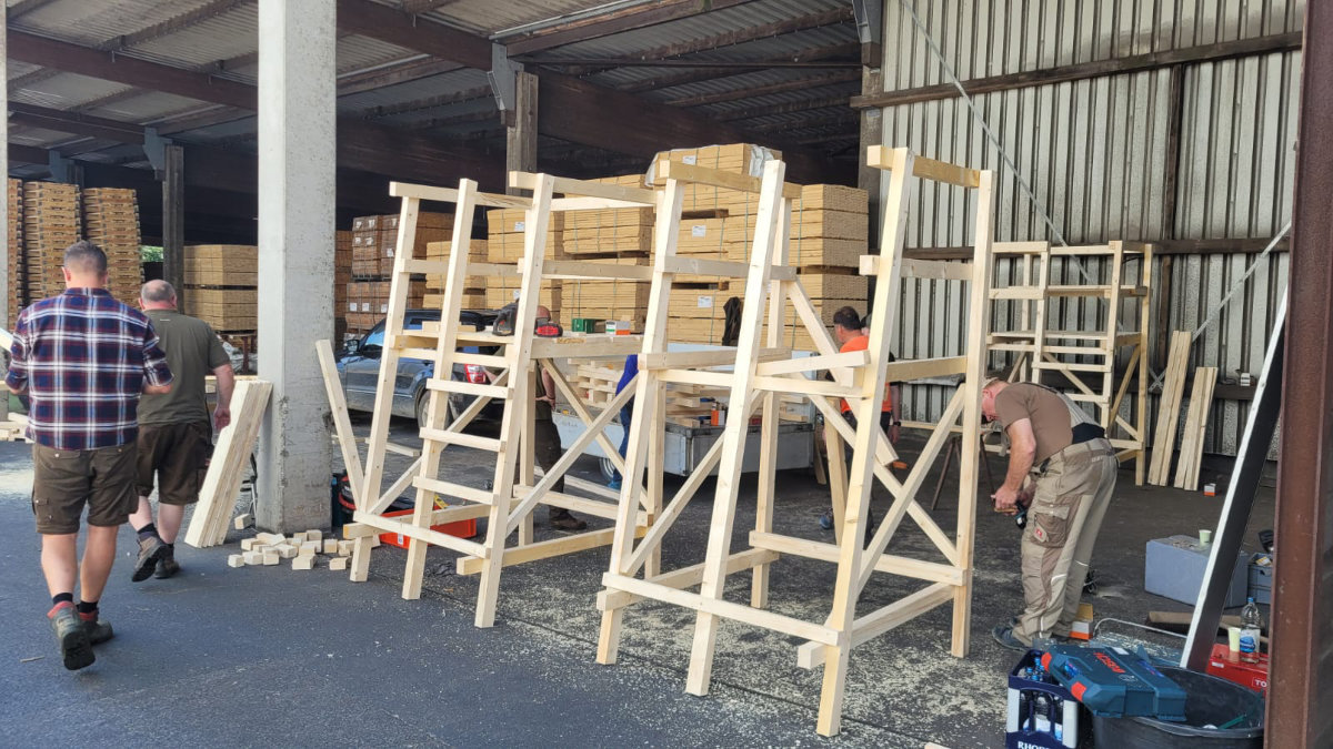 Am Morgen des 21.06.25 ab 8.30 Uhr trafen sich etwa ein Dutzend unserer Hegeringmitglieder „bewaffnet“ mit Akkuschraubern, Zollstöcken, Hämmern, Sägen aller Art und sonstigem Werkzeug auf dem Gelände der Holzwerke van Roje GmbH & Co. KG in Oberhonnefeld-Gierend zum Bau von immerhin 20 Drückjagdböcken – so jedenfalls das Produktionsziel.